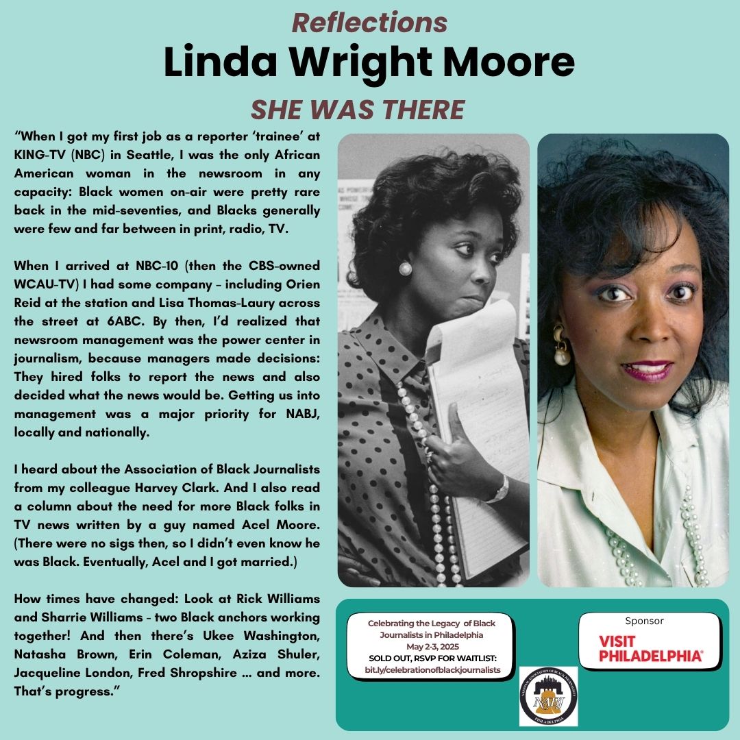 Linda Wright Moore came to Philadelphia in 1981 as a weekend anchor at WCAU-TV (then Channel 10), excited to have made it to a major television market. Her name then was Linda Wright Avery. (She came here from WXYZ in Detroit, the station where Trudy Haynes got her start as the “Weather Girl” in 1963.) Linda became acquainted with the Association of Black Journalists through Acel Moore, a founder of the organization.